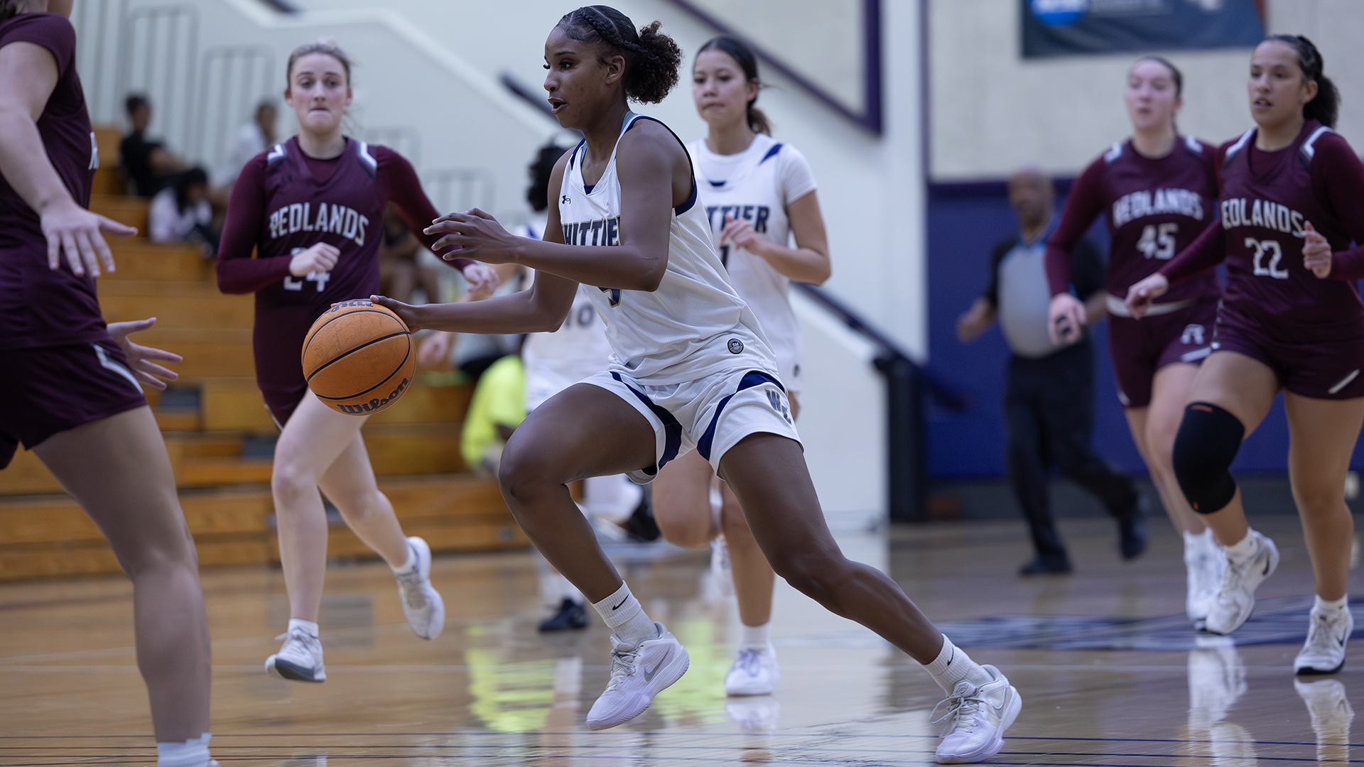 The opening quarter was back and forth and all tied up at 9-9 with 2:34 to play following a triple from Cali Cubel (Oceanside, Calif.). But over the final 2:00 minutes it was all UR going on a 5-1 run to take a 14-11 lead. Whittier put together five in a row to jumpstart the 2nd Quarter behind a Shaeleigh Wright (Long Beach, Calif.) jumper and an and one by Teani White (Burbank, Calif.) to get within two at 17-15.